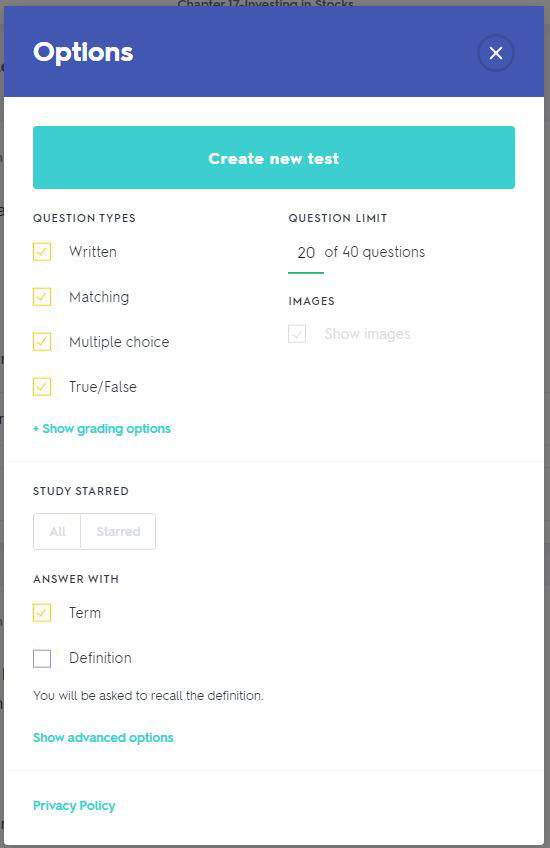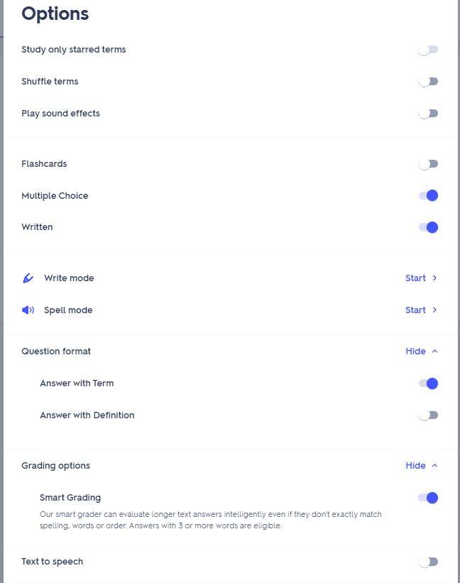 - In the Learn area, click Options on the top right. Your options must be set this way for your score to count. Answer with term only.
