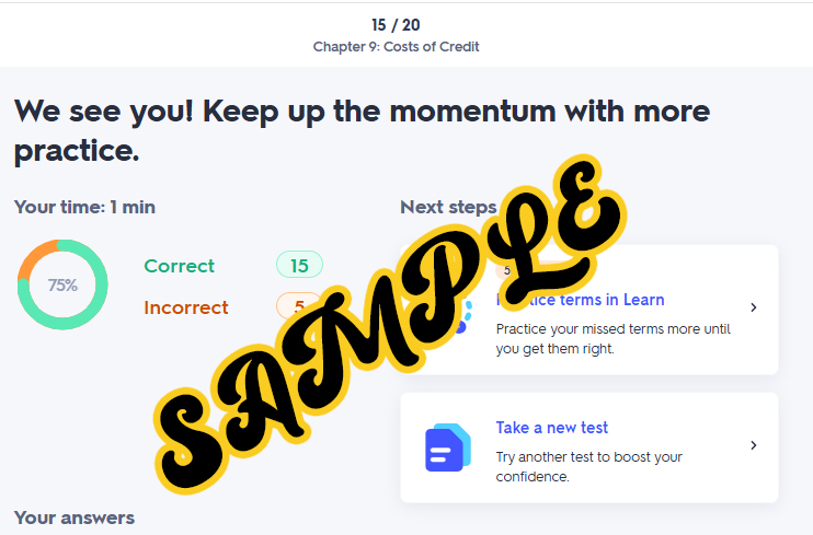 - You must complete the Learn, the Flashcards, the Matching and the Test. If you do not complete all sections then the test score will not count.